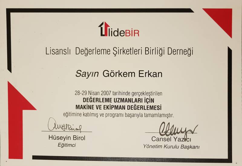 MAKİNE VE EKİPMAN DEĞERLEMESİ SERTİFİKASI